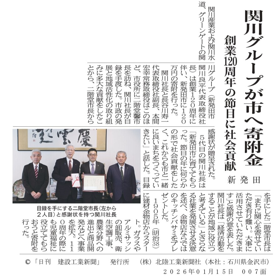 120周年の記念に関川産業・関川水道・グリーンゲートの3社で新発田市に寄付をいたしました!